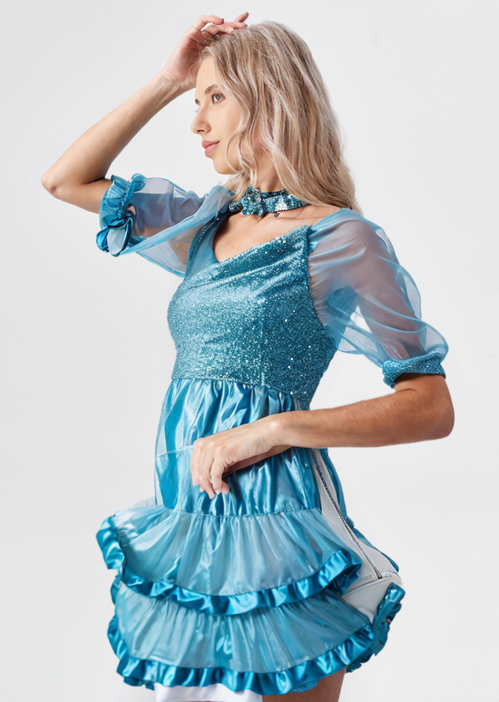 Blue Sequin Ruffled Mini Dress with Choker