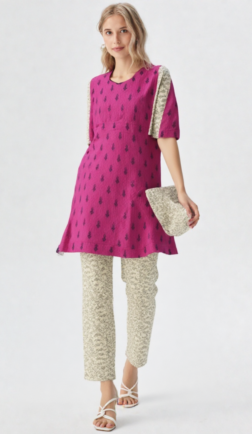 This beautiful fuchsia-colored Kurti set offers the perfect blend of style and comfort. The Kurti features an eye-catching print that gives it a unique and trendy look. Made from a comfortable fabric, this Kurti is perfect for all-day wear. It has a classic neckline and comfortable sleeves.