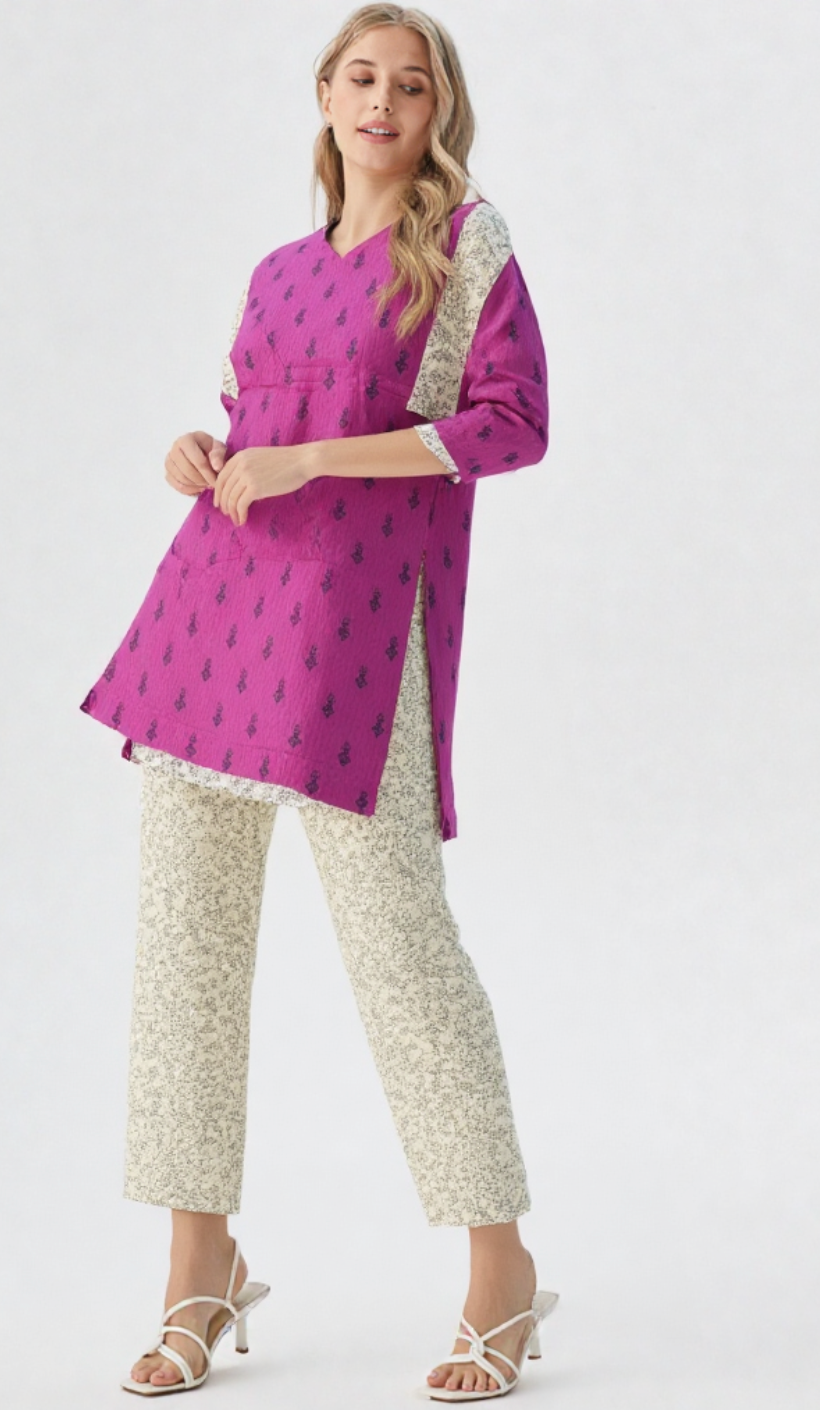 Fuchsia Printed Casual Kurti and Matching Pants Set