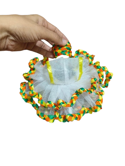 Celebrate devotion with a patriotic flair! The "Tiranga Grace" Laddu Gopal Dress is crafted with delicate white net fabric and bordered with a vibrant braided trim in saffron, white, and green. This airy and festive design is perfect for national holidays, poojas, and daily darshan.